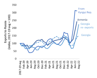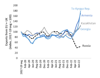 Переориентация торговых потоков произошла очень быстро. По подсчетам ЕБРР, экспорт в Россию из стран Евросоюза, Великобритании и США в мае–июле 2022 г. упал более чем на 50% (здесь и далее — по сравнению со средним значением за этот период в допандемических 2017–2019 гг.). Но одновременно более чем на 80% выросли поставки из западных стран в Закавказье и некоторые страны Центральной Азии.