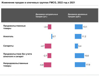 По итогам года войны продажи продовольственных товаров сократились на 2,4% в физическом выражении, а непродовольственных на 5,8%.