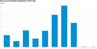 Сколько именно техники и боеприпасов было уничтожено в 2014–2022 гг., оценить невозможно, в большинстве случаев в документации не указано количество. Однако больше всего денег было потрачено на утилизацию ракет — 4,3 млрд рублей, это 55% от суммы всех контрактов. Всего было заключено 74 контракта, в их числе — уничтожение межконтинентальных баллистических ракет, радиоуправляемых ракет, топлива и вспомогательного оборудования.