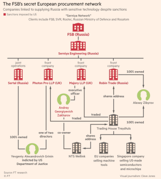 Работавшие на российские спецслужбы фирмы закупали в Европе компоненты и оборудование, от микрочипов до боеприпасов, несмотря на введенные западными странами санкции, — как до начала войны в Украине, так и после, сообщает Financial Times. Фирмы эти были связаны, Министерство юстиции США назвало их «Сетью Серния» — по названию московской компании «Серния Инжиниринг» (специализируется на разработке решений и поставке высокотехнологичного оборудования для измерений и исследований в области микроэлектроники, говорится на ее сайте).