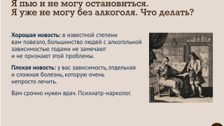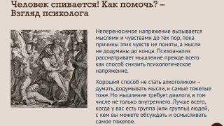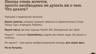 Как успокоиться, когда вокруг такие ужасы? Есть простейший рецепт, и большинство людей им бездумно пользуется: спиртное. Новый выпуск нашего психологического сериала – о том, почему и где надо искать иные, нежели алкоголь, способы вернуть душевное равновесие.