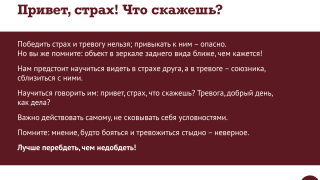 Важность страха и ценность тревоги 02.06.2023 Скопировано! Ужасные новости поступают каждый день, и от обыденности зла ощущение беды притупляется. Новый выпуск психологического сериала – о том, что об опасности забывать нельзя! Скопировано! Больше галерей Мнения Одно расстройство, или Пора покончить с очень вредным мифом Мнения Наши лучшие целители: Софокл, Довлатов и Ремарк Мнения Психологическая перезарядка, или Зачем нам Новый год Мнения Переварить чужбину, или Как кулинария помогает обустроиться в новых обстоятельствах Подпишитесь на нашу рассылку Подписаться Утренняя Еженедельная Спасибо за подписку!