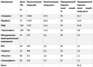 Передача крупных пакетов акций, позволяющих получать дивиденды и участвовать в управлении. Я не включил в список «Роснефть», потому что основная часть ее активов украдена у акционеров ЮКОСа и должна быть возвращена им, на этот счет есть решение суда о выплате мажоритарным акционерам ЮКОСа 50 млрд долларов.