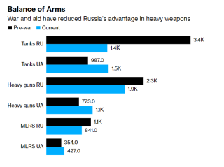 Помощь западных союзников Украине и катастрофические потери военной техники, понесенные российской армией, меняют расклад сил на поле боя. Значительное превосходство в тяжелых вооружениях, которое Россия имела на начало войны, сильно сократилось. А по числу танков украинская армия, по всей видимости, даже обогнала российскую.