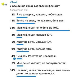 В голосовании участвовало более 4700 человек, и если сложить ответы «Кажется, большая», «Больше 10%» и «Денег не хватает хронически», то получится, что две трети (65%) респондентов озабочены ценами, а если еще исключить тех, ко не находится в РФ, то озабоченных российскими ценами будет 72%, то есть почти три четверти. Заметим, что подписчики VPost – преимущественно вполне обеспеченные люди, то есть, вероятно, проблема и еще острее.
