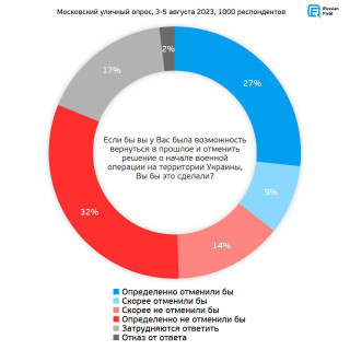 46% москвичей не стали бы отменять решение Владимира Путина вторгнуться в Украину, если бы была такая возможность, показал проведенный в августе опрос Russian Field. За отмену выступили 35% респондентов. Среди молодежи 18-26 лет такого мнения придерживаются 47%.