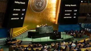 «За» проголосовали 120 из 193 государств. Среди них — Россия, Китай, Франция, Швейцария, Бельгия, Испания, Норвегия, Бразилия и Иран. Против — 14, в их числе Израиль, США, Австрия, Венгрия, Хорватия, Чехия, Парагвай и Гватемала. Еще 45 стран, включая Украину, Великобританию, Германию, Нидерланды, Канаду, Индию, Ирак, Польшу, Финляндию, Швецию, Южную Корею и Японию, воздержались.