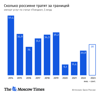 Несмотря на растущую изоляцию страны, россияне наращивают траты за границей. За январь–сентябрь импорт услуг по статье «поездки» составил почти $26 млрд, или почти $3 млрд в месяц, сообщил Центробанк.