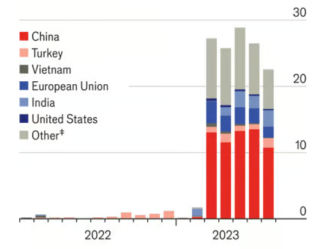 Перелом произошел в марте 2023 г., свидетельствуют данные о российском импорте, которые собрал и проанализировал ISIS (их приводит журнал The Economist). Если в 2022 г. товаров военного и двойного назначения из Китая не поступало, а в январе и феврале 2023 г. поток был минимальным, в пределах $10 000, то уже в марте произошел грандиозный скачок — более чем до $250 000.