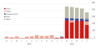 Однако в 2023 г. китайские компании, по данным ISIS, поставляли в Россию полупроводники, необходимые для выпуска различных систем вооружения. Они также продавали навигационное оборудование, детали для реактивных самолетов, а также товары общего назначения, такие как шарикоподшипники, которые используются в артиллерийских орудиях и другой технике.