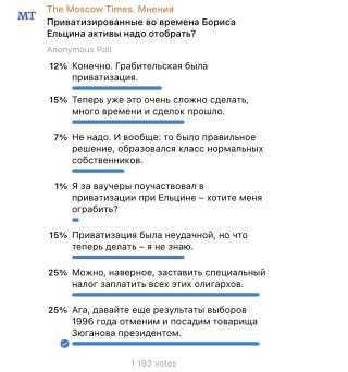 Телеграм-канал рубрики «Мнения» даже провел опрос на тему «грабительской» приватизации.