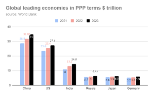 После обновления базы данных Всемирного банка ВВП по ППС у России составил в 2023 г. $6,45 трлн против $6,3 трлн у Японии. В результате Россия оттеснила ее с 4-го места. Теперь Россия уступает лишь Индии ($14,6 трлн), США ($27,4 трлн) и Китаю ($35 трлн).