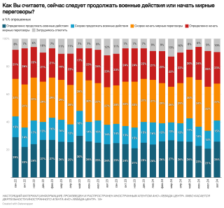 Согласно исследованию, 23% граждан РФ считают необходимым «скорее» начать переговоры, еще 27% заявили, что «определенно» поддержат начало переговоров. Сокращение числа сторонников окончания боевых действий — на 8 процентных пунктов за месяц — стало сильнейшим с начала войны, следует из данных «Левады».