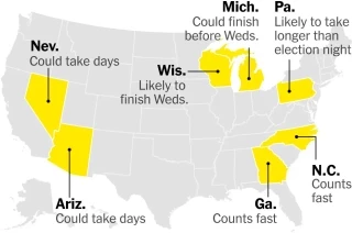 Из колеблющихся штатов лишь два, как правило, голоса быстро — Джорджия и Северная Каролина, тогда как подсчет в Неваде и Аризоне может занять дни, отмечает NYT.
