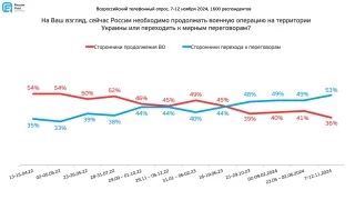 По данным социологов, за переход к переговорному процессу высказались 53% респондентов, а доля тех, кто хотел бы продолжения боевых действий, опустилась до 36%.