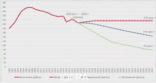 Прогноз в целом негативный. На научно-практической конференции «Пути реализации нефтегазового потенциала Западной Сибири» обсуждалось состояние дел в Ханты-Мансийском автономном округе — Югре — источнике примерно половины российской нефти. Заместитель губернатора округа Алексей Забозлаев продемонстрировал график трёх сценариев нефтедобычи.