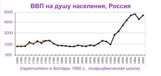 Главным сюрпризом их работы стало выяснение того, что вплоть до 1920-х российский ВВП на душу населения колебался около уровня конца XVII века. И только после окончания НЭПа быстро и почти бесперебойно лез вверх вплоть до конца 1980-х.