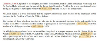 - Голосов за Башара Асада – 10 319 723.
