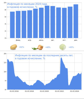 По некоторым оценкам, в прошлом году инфляция почти достигла 10%, и это вызвало почти рекордное повышение ставки. Инфляция явно не думает останавливаться, прирост цен в ближайшие три месяца (в пересчете на год) в январе составил 10,8% против 10,6% в декабре 2024 г., так что же – еще выше ставку поднимать? Тогда все побегут Путину жаловаться. А на что жаловаться, если денег все больше и больше, а товары, которые можно было бы купить, а не выстрелить, не взорвать или не сжечь – такие товары не поспевают за деньгами и дорожают. (Извините за повторение банальностей.)
