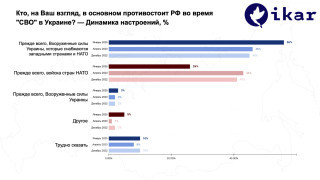 На длинной дистанции пропаганда все же начинает проигрывать реальности. Настроения относительно того, кто непосредственно противостоит российской армии на территории Украины, значительно изменились. Если в 2023 распределение ответов между вариантами — Вооруженные силы Украины, снабжаемые НАТО, и непосредственно войска НАТО — набирали почти одинаковое количество ответов, то сейчас ситуация иная. Доля тех, кто считает, что РФ воюет преимущественно с НАТО, вдвое меньше тех, кто выбирает вариант — ВСУ, снабжаемые западными странами.