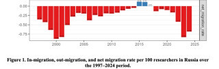 Отток ученых из России наблюдается практически постоянно на протяжении последних 25 лет, следует из подсчетов Ловакова: лишь в середине 2010х, на короткий промежуток времени, чистый коэффициент миграции был положительным — то есть приежало ученых больше, чем покидало страну. Рост миграции исследователей вновь ускорился в 2018 году, а после начала войны процесс принял взрывной характер. В период с 2021 по 2023 год чистый коэффициент миграции с минус 0,17 подскочил до минус 0,83, что стало вторым худшим показателем в истории. Даже в конце 1990-х отток был меньше, следует из данных Ловакова: показатель колебался между минус 0,36 и минус 0,64.