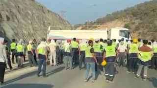 Рабочие перекрыли дорогу около стройплощадки, отмечает издание. Они разбивают едущие к объекту автомобили, требуя выплаты денег. Судя по кадрам, против протестующих применили водометы, в ответ они забросали камнями машину, которая поливала их водой.