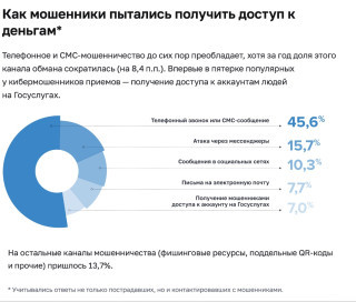 Вот статистика от сервильной компании Kaspersky: в I квартале 2025 года мошенники в 43% случаев использовали сотовую связь, а не мессенджеры. Почти та же доля – в отчете Центробанка РФ: в 45% случаев мошенники получали доступ к чувствительным данным с помощью сотовой связи или СМС и только в 16% — через мессенджеры.