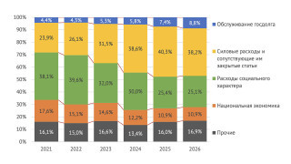 Гражданские и социальные расходы бюджета вытесняются гигантскими тратами на армию и другие силовые структуры. Доля расходов на «национальную оборону», нацбезопасность и правоохранительную деятельность и связанные с ними закрытые статьи выросла с менее четверти (23,9%) в 2021 году до почти 40,3% в текущем и 38,2% в 2026-м. «Это свидетельствует о системной переориентации бюджетных ресурсов в сторону обеспечения безопасности и обороноспособности страны», — подчеркивает Институт Гайдара, добавляя, что это «непроизводительные расходы».
