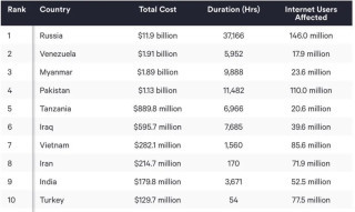 Ущебр российской экономике от «шатдаунов», отключений мобильного интернета, замедления ресурсов и соцсетей эксперты оценивают в $11,9 млрд за год (930 млрд рублей). Это больше, чем у всех остальных стран из рейтинга вместе взятых ($7,8 млрд).
