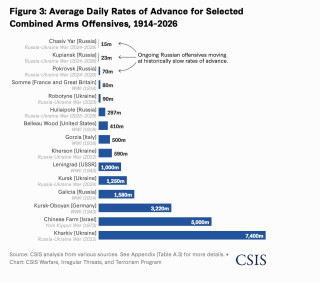 Так, начавшееся в феврале 2024 года наступление на Часов Яр продвигается со скоростью 15 метров в день, подсчитали в CSIS: за неполные два года армия прошла лишь 10 км и полностью взять город под контроль так и не смогла.