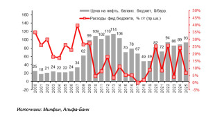 По сравнению с 2024 годом балансирующая бюджет цена увеличилась на $4, по сравнению с с 2023-м — на $7, а относительно довоенного 2021-го — на $21. В результате этот показатель приблизился к рекордным уровням начала 2010х гг, когда для баланса бюджету требовалась цена барреля около $100 и выше.