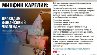 Гражданам России предложили устроить «челлендж» под названием «Февраль без трат» с отказом на месяц от «необязательных расходов» — приобретения одежды, поездок в такси, походов в кафе и рестораны, а также «развлечений вроде кино». Пост с таким содержанием, как отмечает «7X7, опубликовал во «Вконтакте» Минфин Карелии, которая регулярно становится одним из аутсайдеров рейтингов российских регионов по качеству жизни.