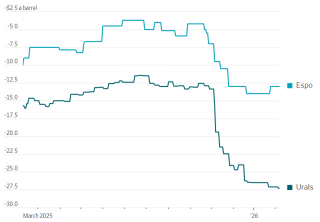 По ее словам, «сроки реализации этих баррелей будут во многом зависеть от уровня скидок, предлагаемых потенциальным покупателям». Для Urals в портах загрузки они достигли рекордных $27,3 за баррель по отношению к Brent в результате безостановочного роста с начала ноября, по данным Argus Media. Скидка на дальневосточный сорт ESPO составляет $13.
