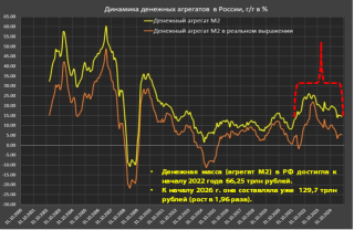 Что после начала войны рост денежной массы (агрегат М2) стал ускоряться и вместо обычных 10-12% в год достиг 15-25% (зона, выделенная красной скобкой). Денежная масса России увеличилась с 66,25 трлн руб. на начало 2022 г. до 129,7 трлн руб. на начало 2026 г., то есть почти удвоилась (+96%). А ведь, по бодрому отверждению премьера Мишустина 25 февраля 2026 г., ВВП РФ за последние 3 года (после падения в 2022 г.) вырос на 10%.