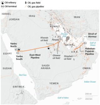 Возможности частичного преодоления блокады Персидского залива существуют. После 1970-х годов Саудовская Аравия построила нефтепровод со своего восточного побережья, у Персидского залива, на западное, у Красного моря, – как раз на такой случай, как сегодня. По нему нельзя перебросить весь объем саудовского экспорта, но заметно смягчить дефицит возможно – мощность трубопровода составляет 5 млн баррелей в сутки.