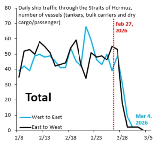 До войны по Ормузскому проливу ежедневно проходило примерно по 50 судов в каждую сторону, из которых около двух третей – это танкеры для перевозки сырой нефти, нефтепродуктов или СПГ, отмечает Робин Брукс, старший научный сотрудник программы глобальной экономики и развития в Институте Брукингса. Сейчас таких судов единицы.