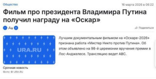 Кстати, о Кремле. Спасибо иноагенту Александре Архиповой и ее каналу «(Не) занимательная антропология». Она выделила один из ключевых принципов z-СМИ, пишущих о фильме, – пересказать новость о премии «фокусируя внимание читателей на чем-то другом». В «Осторожно, новости» — это лента «об изменениях в школах после начала СВО». В «Ура.ру» заголовок — «Фильм про Путина получил Оскара». Потом его убрали. Но умельцы сберегли.