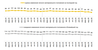 Впервые с декабря 2022 г. на вопрос об ожиданиях изменения своего материального положения в ближайший год было получено больше негативных ответов, чем позитивных: индекс этих ожиданий составил 99 пунктов (больше 100 – преобладают ожидания улучшения, меньше – ухудшения).