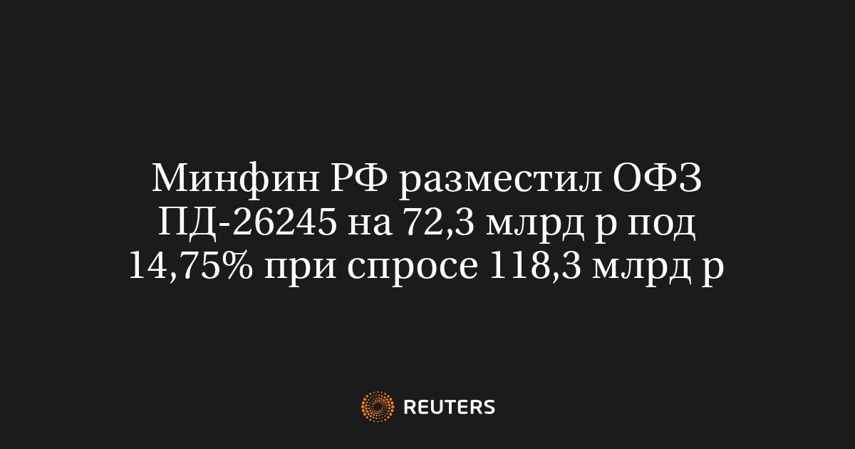 Минфин РФ разместил ОФЗ ПД-26245 на 72,3 млрд р под 14,75% при спросе 118,3 млрд р